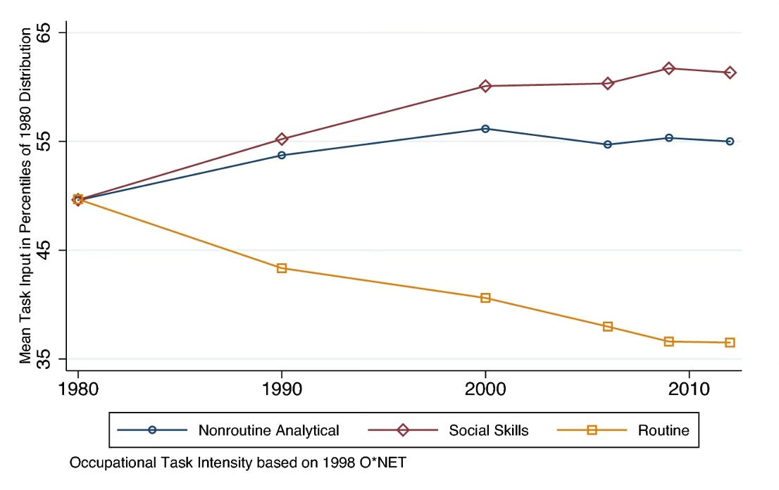 I dag är vi inte lika beroende av andra människor för vår direkta överlevnad, men eftersom både våra samhällen och arbeten blivit mer komplexa har behovet av social förmåga ökat på senare år. Förklaringen är att arbete i team blivit en central del av många yrken. I stället för en enskild individ som gör lite av varje, ökar produktiviteten när flera specialister samarbetar. Samarbetet innebär dock vissa “koordinationskostnader”, men sociala färdigheter fungerar som ett smörjmedel som underlättar samarbetet och sänker dessa kostnader.